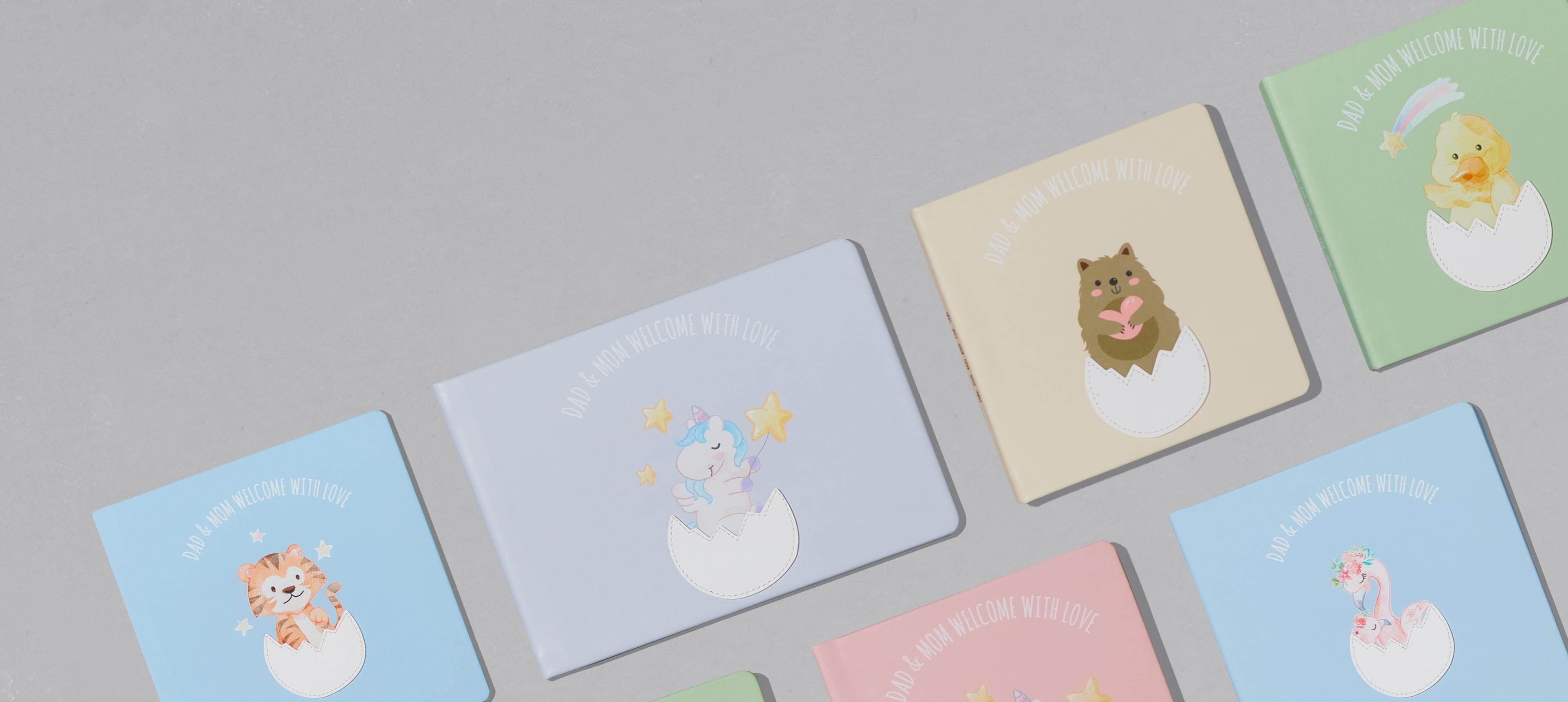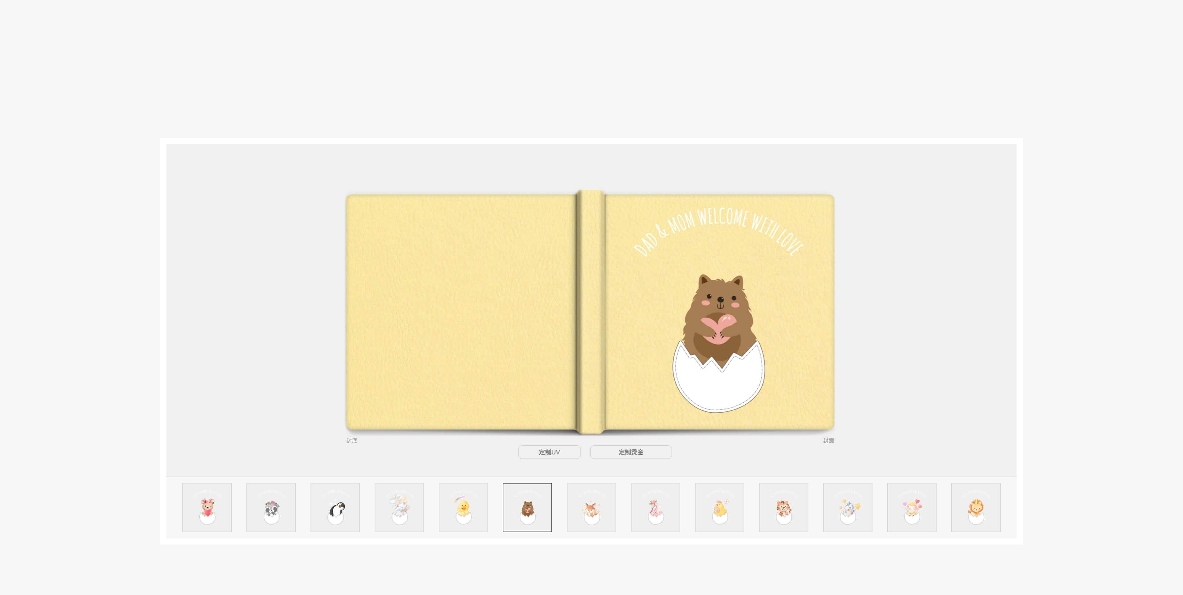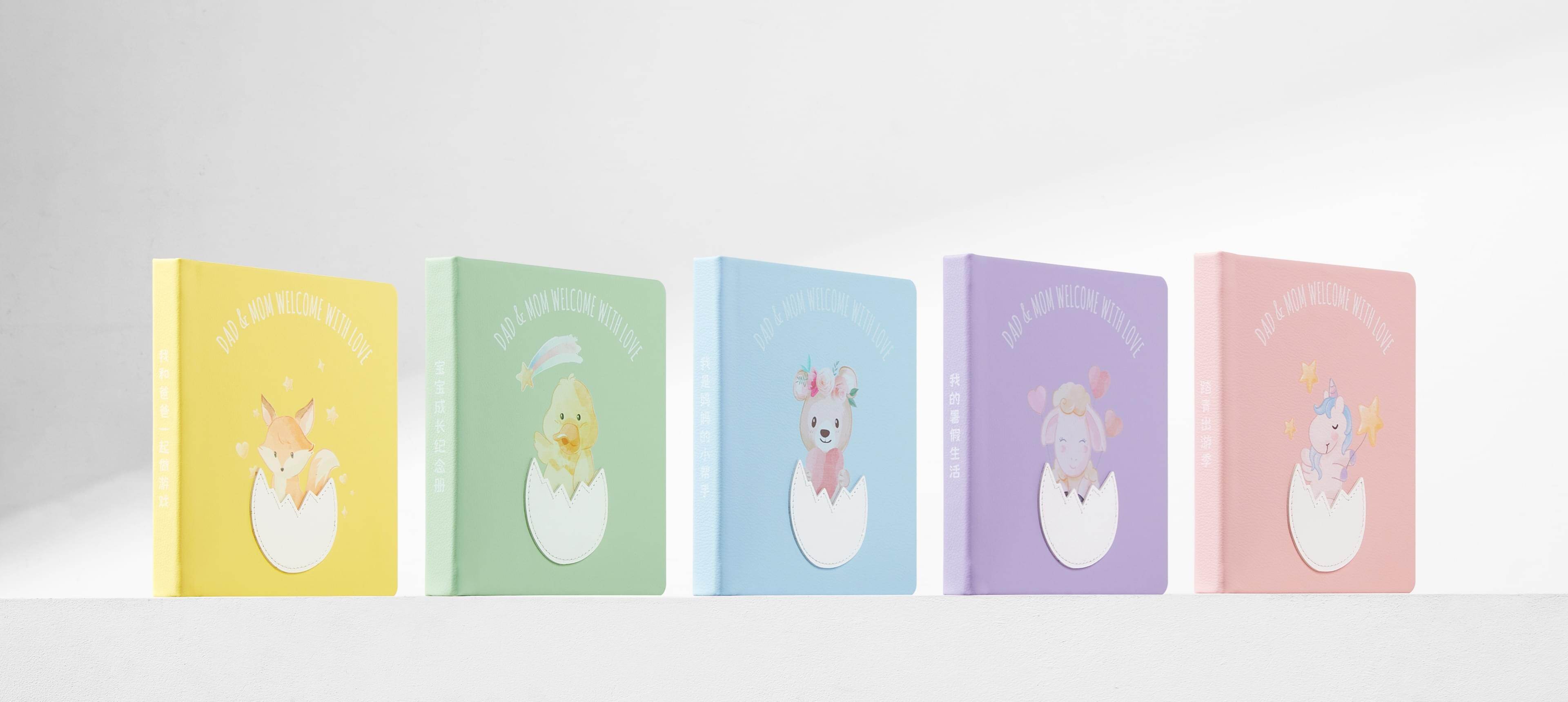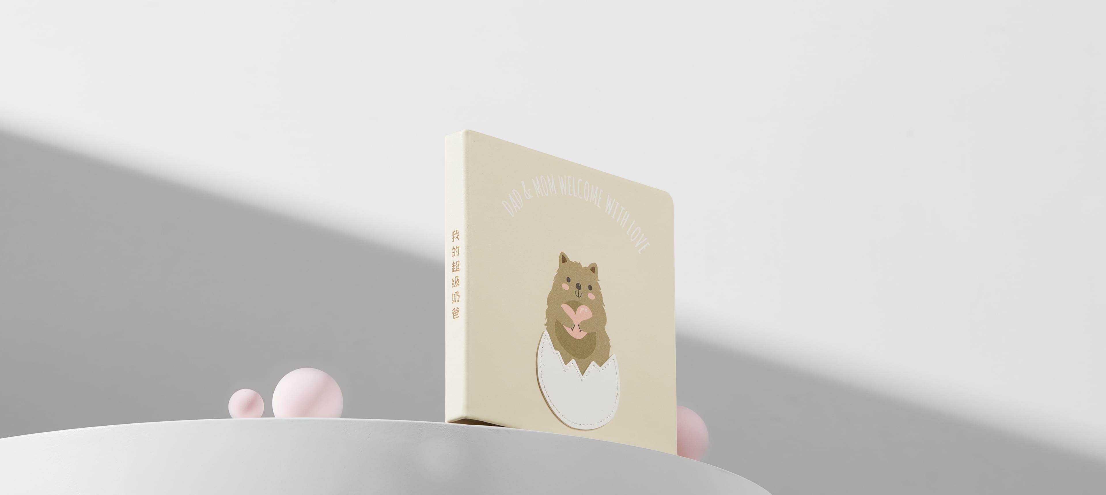 相册封面融合插画工艺,搭配专属新生儿定制的破壳卡通设计,皮面环保、细腻,封面纯手工制作